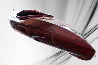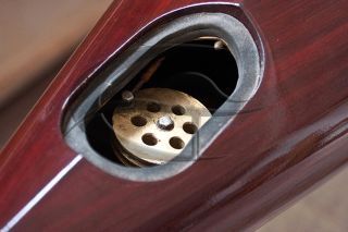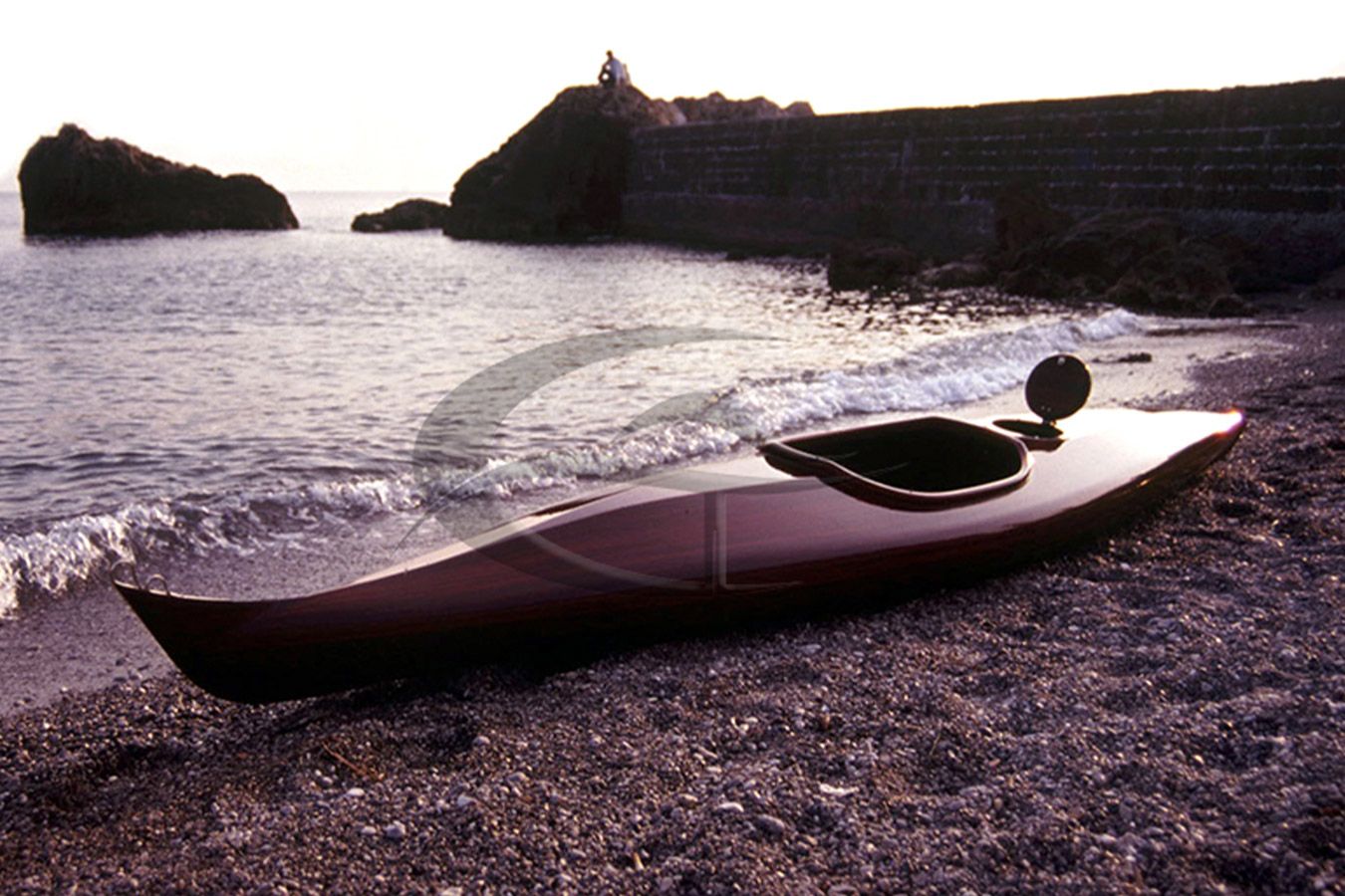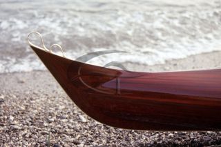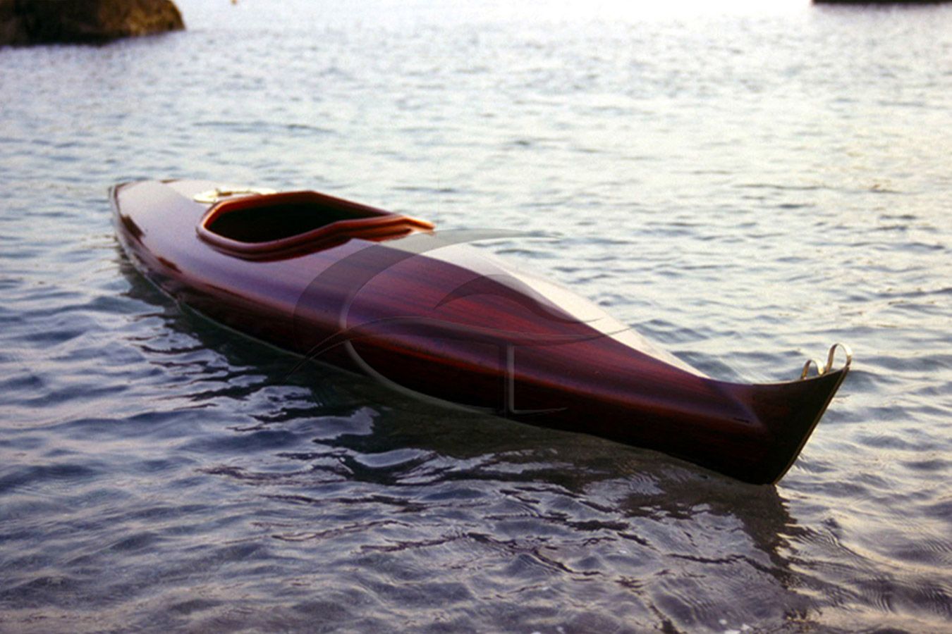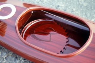 Kayak realizzato in legno di padouk su disegno originale ed esclusivo, corredato di gavone stagno e timoneria regolabile.